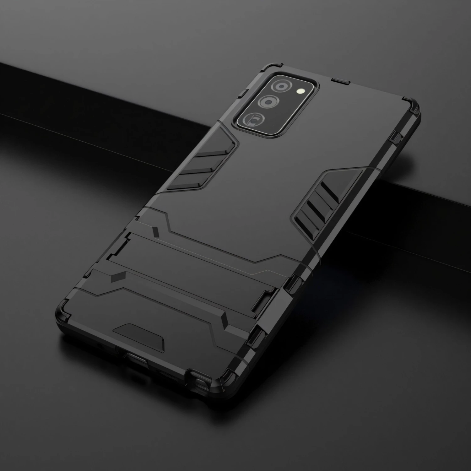 Voici la coque Samsung Note 20 avec béquille noire pour protéger votre smartphone. Cette protection supporte les chocs et les rayures à la place de votre Samsung Galaxy Note 20 avec sa composition hybride avec une partie en silicone et une autre en polycarbonate.