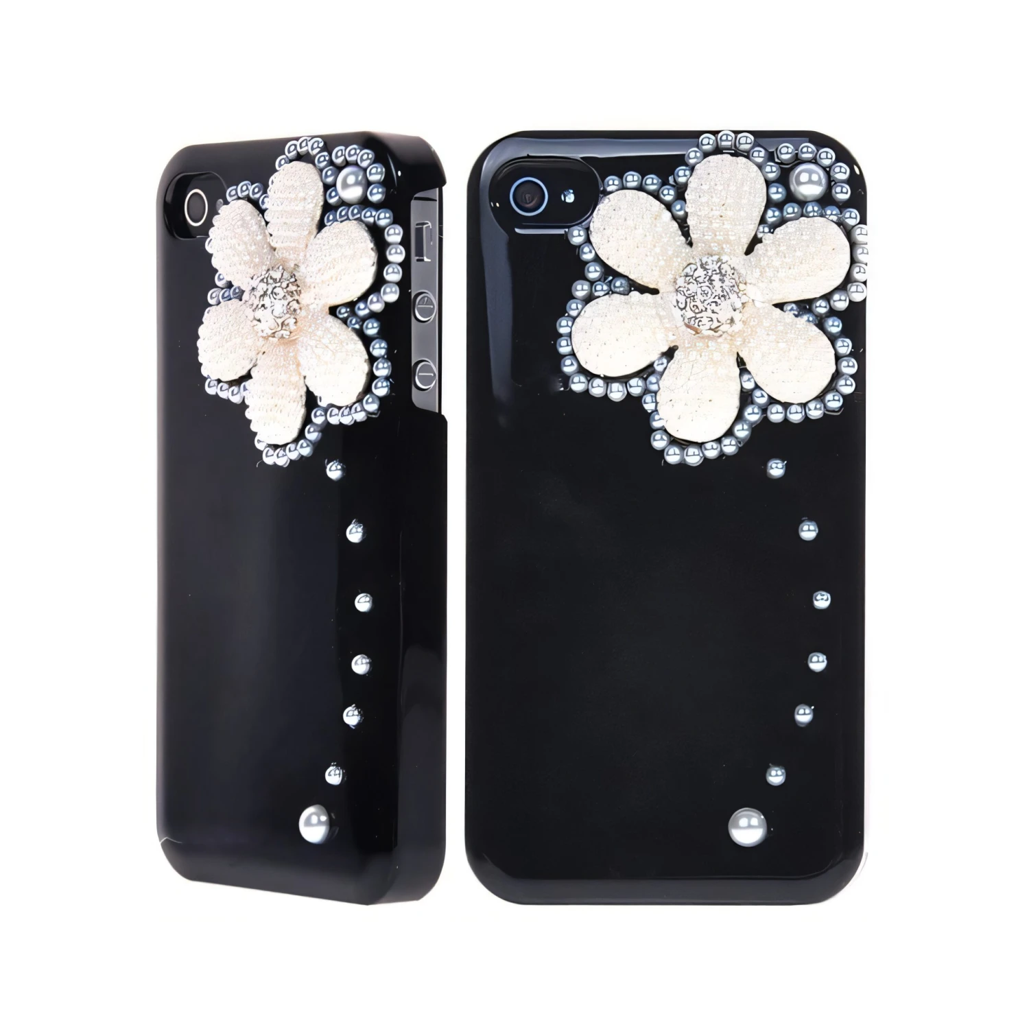 Jolie coque aspect laqué pour Iphone 4 et iPhone 4S en PVC très élégante et originale. La jolie fleur est composée de strass et de petites perles.