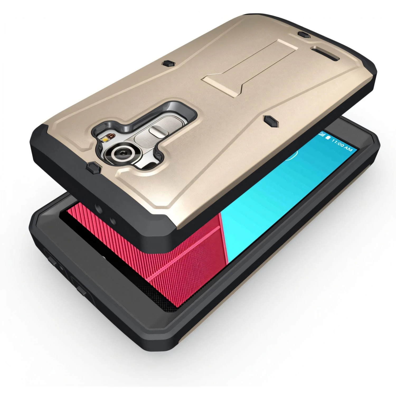 Avec cette coque ultrarésistante, vous vous assurez une protection optimale de votre LG G4. C’est une coque composée de plusieurs éléments en silicone et PVC. Votre smartphone est inséré à l’intérieur et est recouvert intégralement. Ce qui lui assure une sécurité contre tous les chocs et rayures. Le petit plus sympa: son petit support incorporé à la coque.