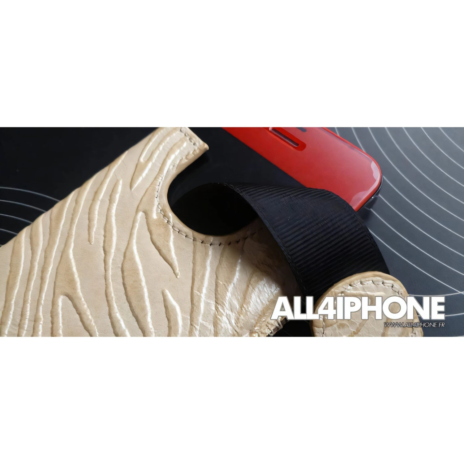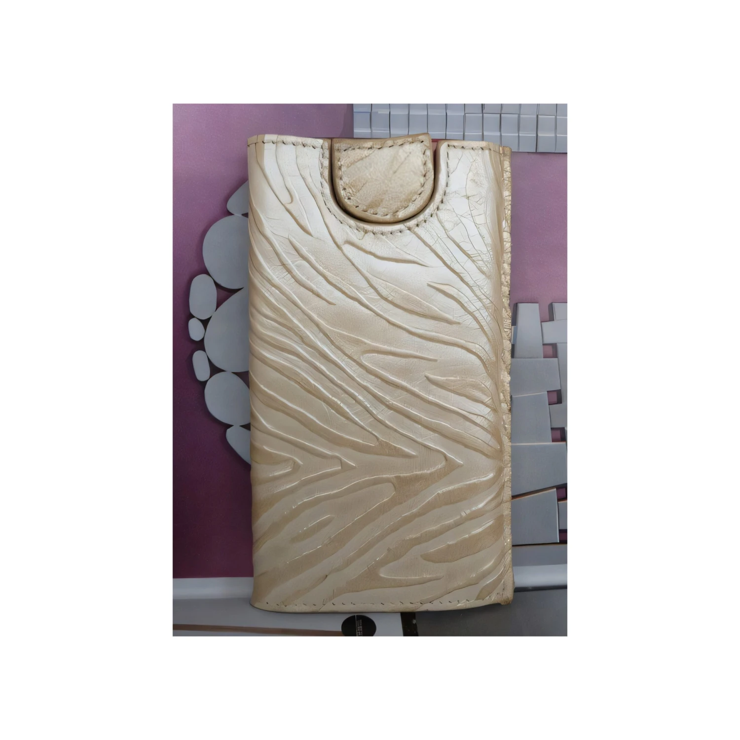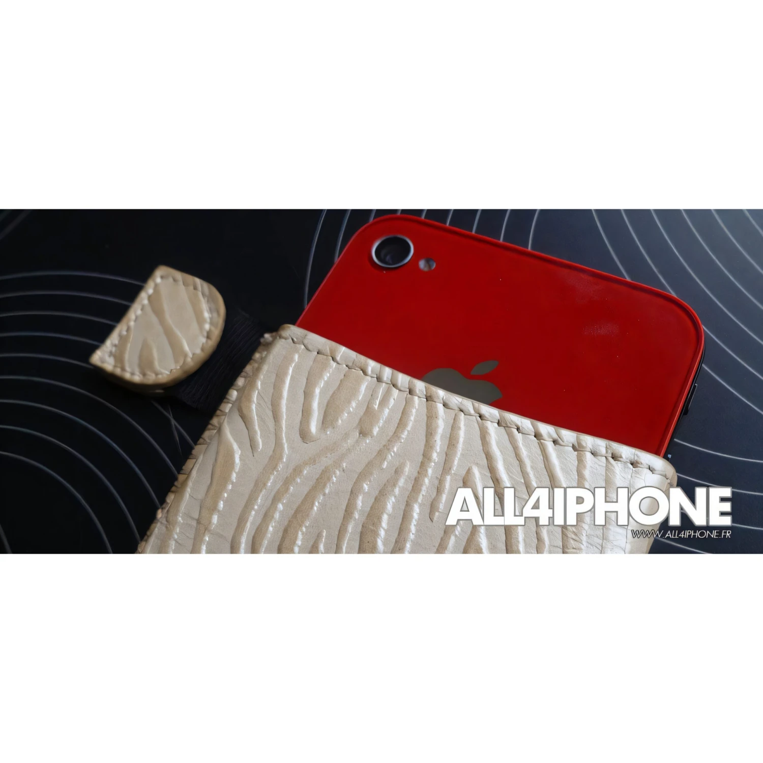 Très belle pochette en cuir d’aspect tigré compatible avec les iPhone 4, 4S, 3G et 3GS. Le téléphone est bien à l’abri et se retire grâce à sa petite languette. Très belle finition.